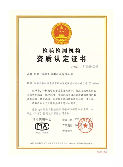 熱烈祝賀華慧(江蘇)檢測技術(shù)有限公司獲得檢驗(yàn)檢測機(jī)構(gòu)資質(zhì)認(rèn)定證書(CMA)。